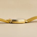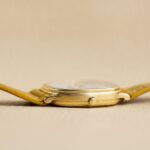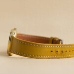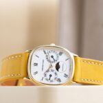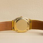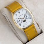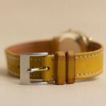 - The yellow leather strap accentuates the warm tones of the watch’s yellow-gold case