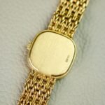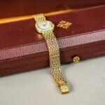 • The watch is secured to the wrist by a mesh-like bracelet, also crafted in 18k yellow gold