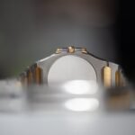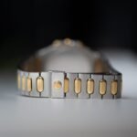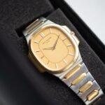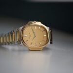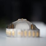 Made in two-tone 18K yellow gold and stainless steel it is paired nicely with a champagne dial with an elliptical outer sector and batons. The bracelet presents elongated centre-links and is integrated to the case so much so there are no lugs, making the watch sit on the wrist just like jewellery. To retain a slim profile, the watch is powered by a quartz movement, synonymous with industries trends of the 1970s and 1980s.