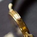 The 18K yellow gold case measures a traditional 33mm in diameter and features a “Clous de Paris” bezel created by hand using a Rose Engine. These intricate pyramid-shaped accents in concentric circles have become a signature of the model line.