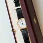 The dial is white lacquered, with black painted Roman numerals and leaf-style hands. Simple in its design, it incorporates a small date aperture at the 3 o’clock position. The movement is the Patek Philippe Cal. 315SC, which is automatic with a 48-hour power reserve.