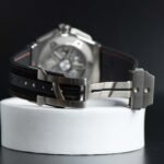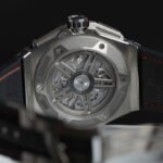 • The sapphire dial shows some the movement’s key components underneath, tying into this watch’s motorsport theme