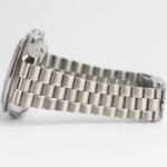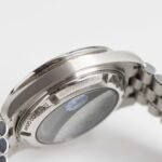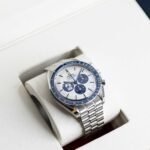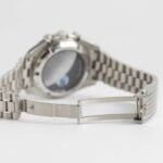 • Instead of the Moonwatch’s utilitarian black dial, this reference has a vibrant silver finish with blue sub-registers and a matching blue tachymeter scale