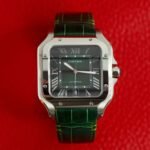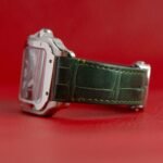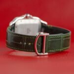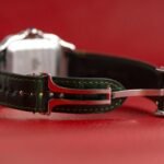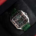 • A modern interpretation of a Cartier icon featuring a dark green dial with a sunburst finish