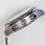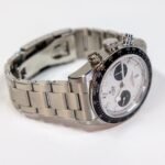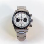 • Re-launched in 2021, it’s available in two dial configurations including this white ‘panda’ version with black chronograph sub-registers and a black tachymeter embellished bezel
