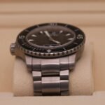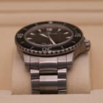 The bracelet is in excellent condition with some small hairlines and marks. It has all the links and will fit around a 7.75″ wrist. The extra grey sailcloth and black rubber straps are in excellent condition with some mild signs of wear.