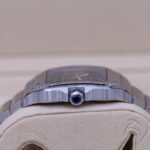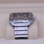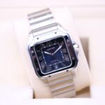 This Cartier Santos is in brand new condition. It is the mens watch in large size and comes with the other strap and clasp. It is the very desirable blue dial. It is complete with box and papers and was originally sold in February of 2022.