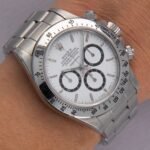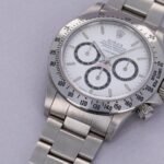 Featuring the Daytona’s stunning ‘porcelain’ white lacquered dial, the ref. 16520’s panda dial is a collector favorite thanks to its subtle black subdial rings that give it its ‘Panda’ nickname. However, offered as a true rarity, this example features a ‘floating’ dial (also considered the Mk. 1 dial) whereby its “Cosmograph” inscription is not tight to the four lines of text above it as usual but spaced below – a rare oddity specific only to R-serial ref. 16520s.