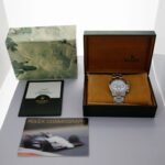 Watch is in excellent overall condition. The case shows light signs of wear, with some surface marks visible on the bezel and case edges. Enamel on the original 200 unit bezel is crisp and fully intact. Original MK1 “Floating” dial is excellent. There are minor signs of wear visible upon closer inspection, including some light marks visible along the subdial edges. The minute hand has a slight discoloration on the edge closest to the center. Watch comes on an oyster bracelet with 12 links total, 2 of which are removable. It fits an approx 7 1/4″ wrist and shows minimal stretch. Watch comes with its original box and papers, including the punched guarantee paper.