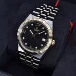 This example features a black diamond dial with roman numerals at the 12, 3, 6 and 9pm. It has an RRP of £3,710.